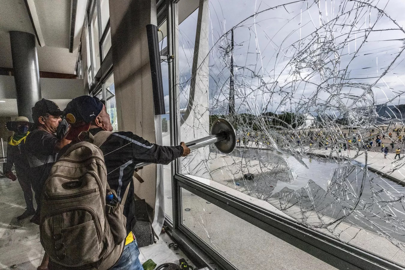 Cuando llegaron los autobuses a la capital, los fascistas vestidos con las camisetas de la selección brasileña de fútbol marcharon a primera hora de la tarde, sin sufrir interferencias ni acoso policial en un lugar que suele estar fuertemente vigilado y ser de difícil acceso. Se acercaron a los edificios del Congreso Nacional, el Supremo Tribunal Federal y el Palácio do Planalto (el palacio presidencial). Estas son las sedes de los tres poderes federales de Brasil: legislativo, judicial y ejecutivo. Los manifestantes asaltaron los edificios, destruyeron ventanas, equipos y mobiliario y dañaron y robaron objetos históricos y obras de arte raras de Candido Portinari, Emiliano Di Cavalcanti y Victor Brecheret valoradas en millones de dólares. Robaron documentos y armas de la Oficina de Seguridad Institucional, situada en la planta baja del Palacio del Planalto, lo que sugiere la posibilidad de que algunos de ellos tuvieran acceso previo a información sobre la ubicación de las mismas.