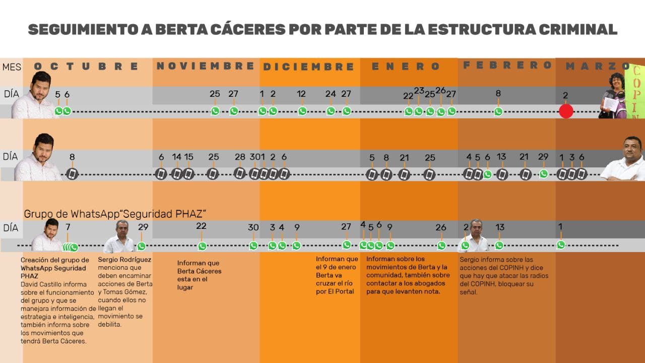 Por esta razón, menciona el Copinh, el 7 de octubre de 2015, Castillo creó un grupo de WhatsApp denominado Seguridad PHAZ, con el propósito de vigilar y paralizar las actividades de reivindicación de derechos del pueblo Lenca liderados por Berta Cáceres.