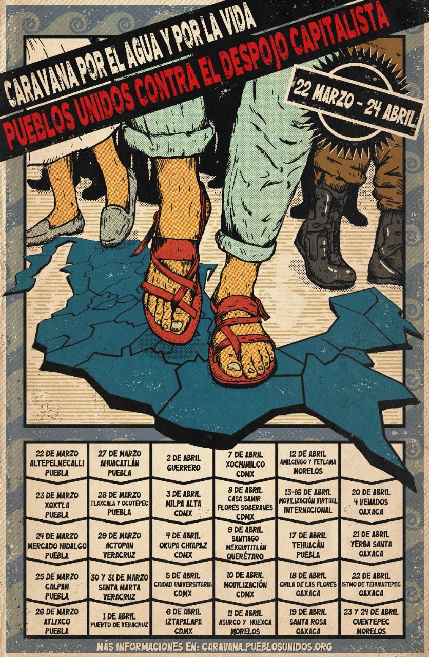 Durante 34 días, organizaciones y colectivos de Puebla, Tlaxcala, Veracruz, Ciudad de México, Estado de México, Morelos, Oaxaca, Guerrero y Querétaro integrarán la Caravana por el agua y por la vida: Pueblos unidos contra el despojo capitalista para visibilizar las luchas de México, además de Europa, África, Asia, Sudamérica y Norteamérica.