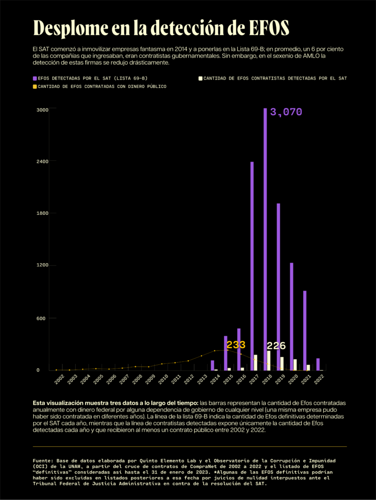Una base de datos elaborada por Quinto Elemento Lab y el Observatorio de la Corrupción e Impunidad (OCI) del Instituto de Investigaciones Jurídicas de la UNAM cruzó el listado de EFOS definitivas registradas hasta el 31 de enero de 2023 con los contratos de Compranet de 2002 a 2022. El análisis reveló que, en ese lapso, 486 dependencias de todos los niveles firmaron contratos por más de 11 mil 492 millones de pesos con 834 empresas fantasma.