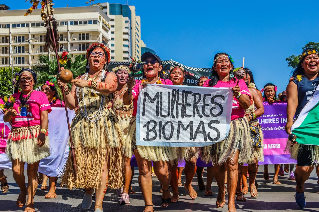 Algunos fotógrafos van buscando capturar con sus lentes a las mujeres indígenas que han sido elegidas por sus pueblos para participar en política, la llamada bancada del cocar (penacho). Pero Sonia Guajajara, ministra de los Pueblos Indígenas, y Célia Xakriabá, diputada federal, no van al frente de la marcha. Caminan y bailan en los contingentes de sus pueblos, de quienes toman el apellido. Al finalizar la marcha, ellas y otras indígenas en puestos de poder político, como la directora de la Fundación Nacional del Indio (Joenia Wapichana), toman la palabra para rendir cuentas de sus acciones políticas y para llamar a las mujeres a seguir participando en la organización de los pueblos.