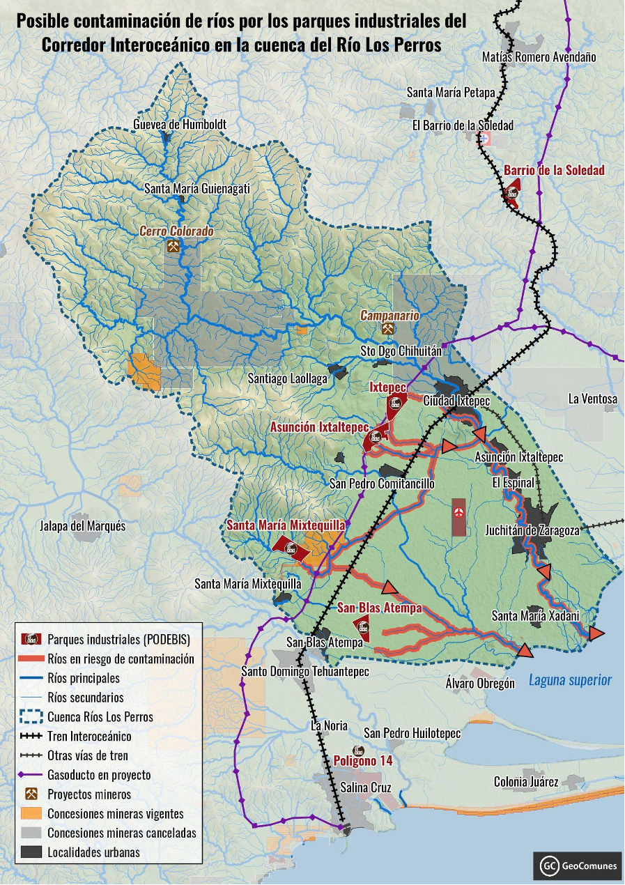 La instalación de nuevas actividades industriales en la zona y el crecimiento urbano asociado a ellas agudizará la grave situación de sequía y contaminación en la cual se encuentran muchos de los ríos de la región. Ejemplo de esto es el caso de cuatro parques industriales (PODEBI) previstos en Oaxaca que se encuentran dentro de la cuenca del río Los Perros, ya que afluentes del río cruzan las zonas de los parques industriales previstos y podrían provocar una mayor contaminación de este río y del macrosistema lagunar asociado.