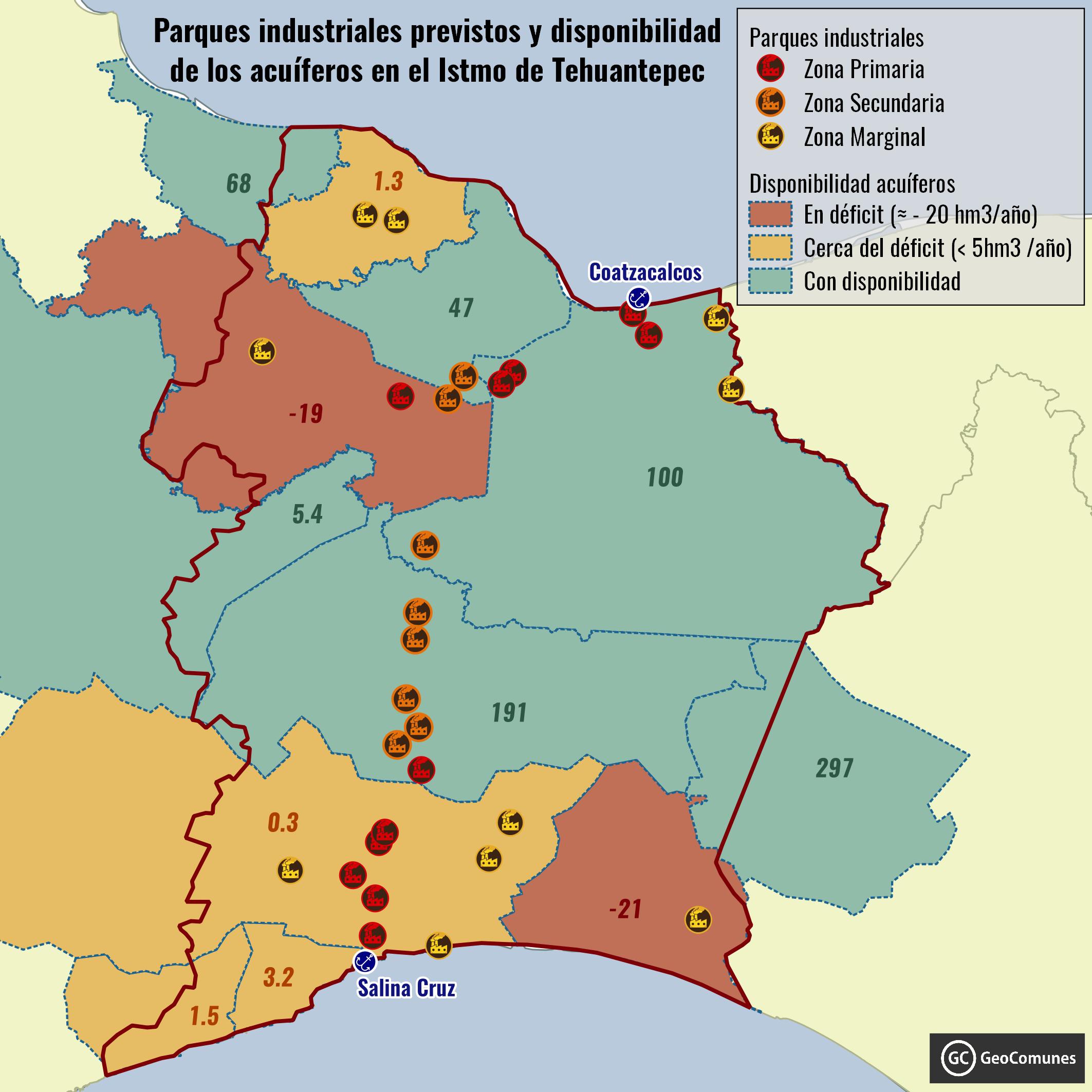 Según el documento “Resumen Ejecutivo Plan Estratégico y Plan Maestro Conceptual del Corredor Interoceánico del Istmo de Tehuantepec” el gobierno estima que, para 2040 la demanda de agua para los parques industriales previstos será de 324 millones de m3 / año. Eso representa más de la mitad de toda el agua actualmente concesionada en los 79 municipios del istmo (625 millones de m3 / año) para el conjunto de usos (industrial, agrícola, público-urbano, etc.). Esos parques industriales consumirán en conjunto dos veces más agua que lo que consume actualmente el conjunto de la población istmeña (148 millones de m3 / año).