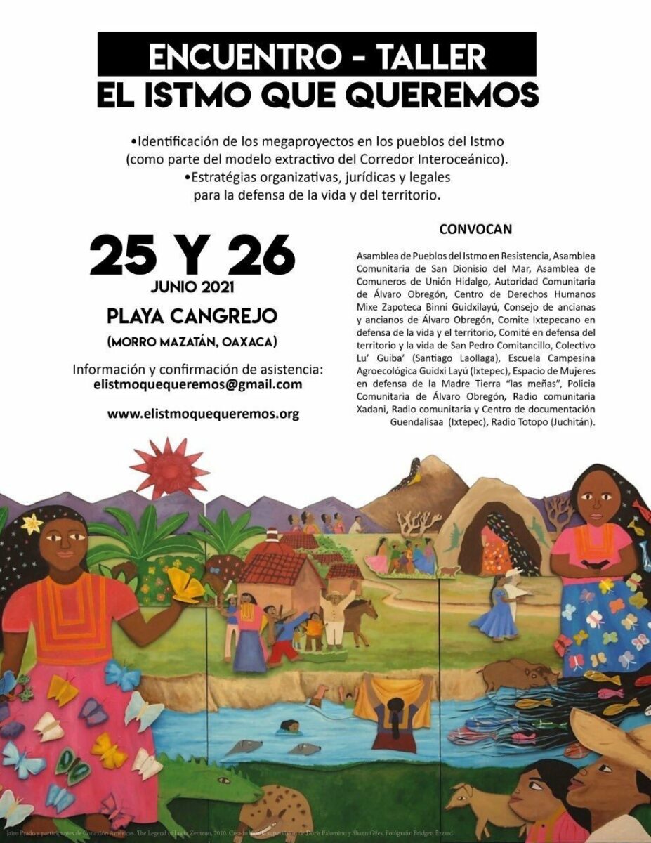 Entre las diversas expresiones de descontecto y resistencia que articulan en el llamado “Corredor Interoceánico”, el 25 y 26 de junio, en Playa Cangrejo (ubicada en Morro Mazatlán, Oaxaca), será sede y testigo del encuentro-taller “El Istmo que queremos”. Un evento convocado por habitantes de varios los rincones de la región, hasta ahora articulados en 15 organizaciones según su convocatoria: la Asamblea de Pueblos del Istmo en Resistencia, Asamblea Comunitaria de San Dionisio del Mar, Asamblea de Comuneros de Unión Hidalgo, Autoridad Comunitario de Álvaro Obregón, Centro de Derechos Humanos Mixe Zapoteca Binni Guidxilayú, Consejo de ancianas y ancianos de Álvaro Obregón, Comité Ixtepecano en defensa de la vida y el territorio, Comité en defensa del territorio y la vida de San Pedro Comitancillo, Colectivo Lu’ Guilba’ (Santiago Laollaga), Escuela Campesina Agroecológica Guidxi Layú (Ixtepec), Espacio de Mujeres en defensa de la Madre Tierra “las meñas”, Policía Comunitaria de Alvaro Obregon, Radio Comunitaria Xadani, Radio comunitaria y Centro de documentación Guendalissa (Ixtepec), Radio Totopo (Juchitán).