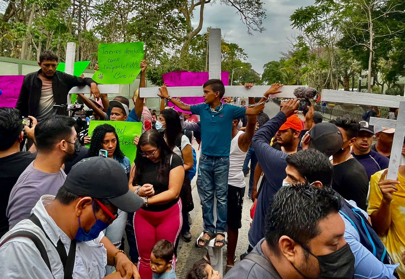 El pasado 11 de marzo, al menos 300 personas de diferentes nacionalidades protestaron durante la conferencia mañanera del Ejecutivo federal, realizada en Tapachula. Se cosieron los labios, mientras menores de edad y mujeres se encadenaron a cruces de madera a las afueras de la 36 Zona Militar que, en su interior, contaba también con la presencia del titular de Migración, Francisco Garduño Yáñez y el gobernador de Chiapas, Rutilio Escandón Cadenas.