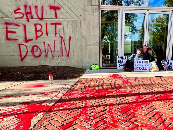 En una semana, un nuevo grupo inspirado en la red británica de acción directa Palestine Action (y que operó brevemente con el mismo nombre) impidió a los trabajadores de Elbit acceder a su oficina de Cambridge. Antes de la hora de apertura, tres activistas de Palestine Action US bloquearon la puerta del edificio atando sus cuellos con candados de bicicleta a las manillas de la puerta. Uno de ellos también derramó pintura roja por la acera y pintó con spray «Shut Elbit Down» (Cierren Elbit) en el edificio. Tras haber disuadido con éxito a los empleados, los y las activistas pudieron desbloquearse y escapar a casa ante las atónitas miradas de la policía de Cambridge.