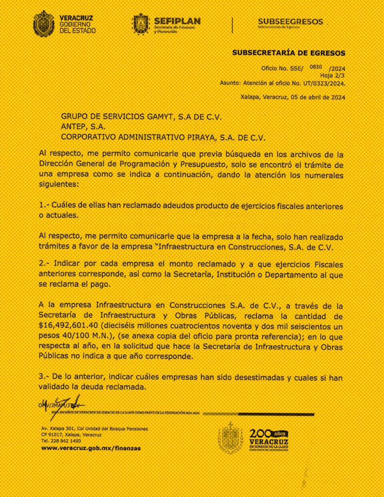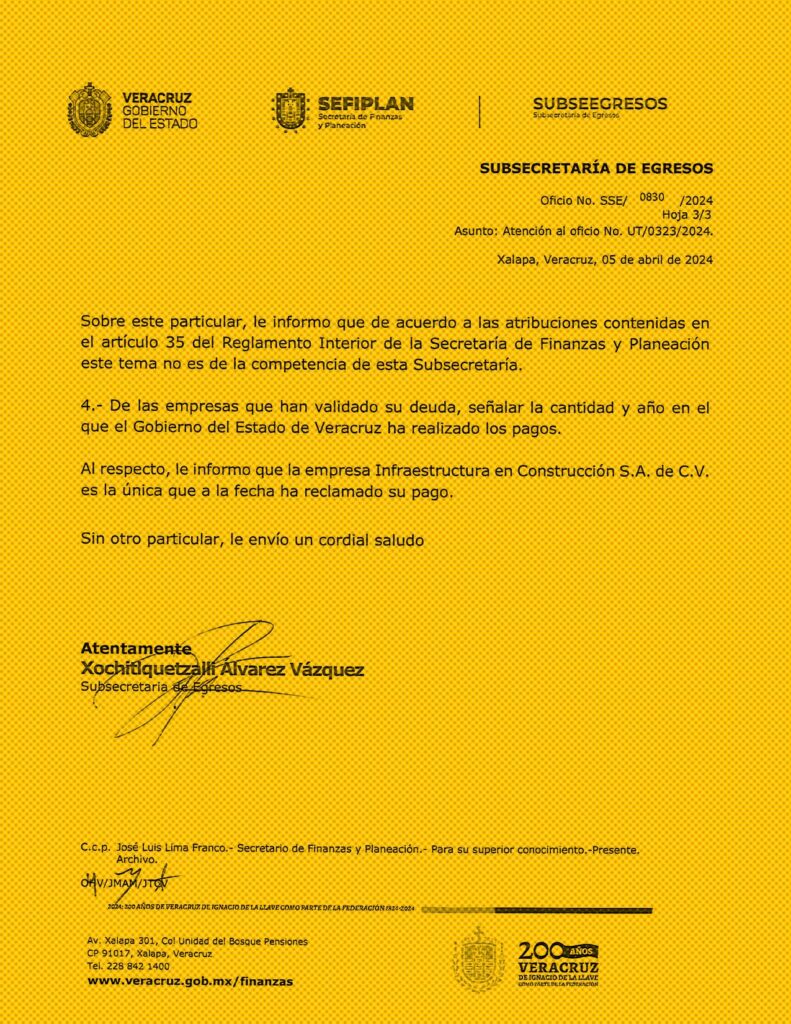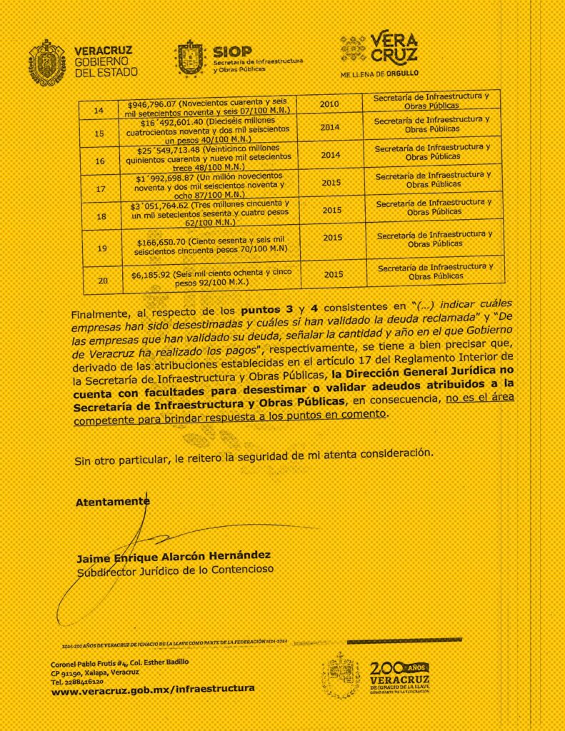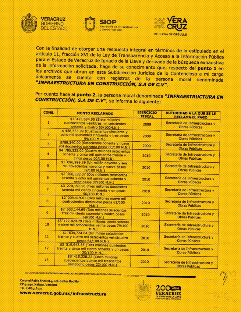 En respuestas enviadas por Transparencia, el Gobierno de Veracruz —en el periodo de Cuitláhuac García Jiménez— reconoció que Infraestructura en Construcción exigió el cumplimiento de un adeudo por 16.4 millones de pesos relacionado con 20 obras contratadas entre 2009 y 2015. Según un oficio entregado por la Secretaría de Finanzas y Planeación de la entidad, la administración no había pagado a la empresa fantasma. La dependencia no respondió al cuestionario por escrito que se le envió.