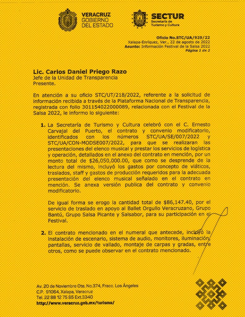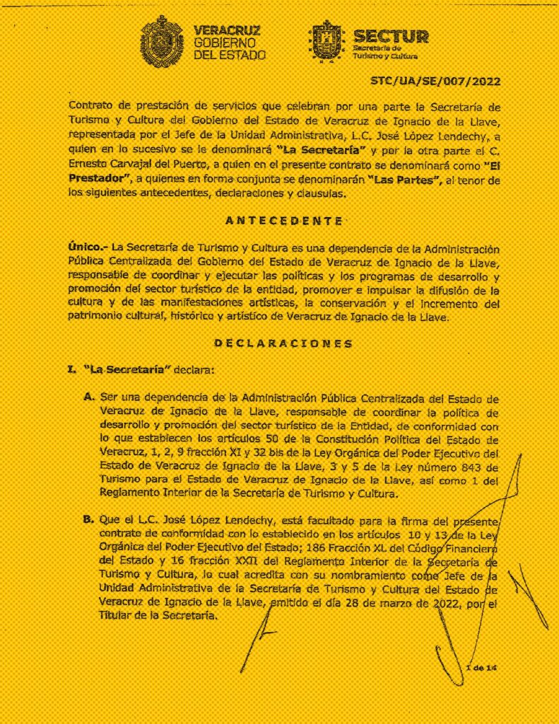 El Gobierno de Veracruz lo contrató en 2019 para conseguir a los artistas musicales de las Fiestas Patrias y obtuvo casi 30 millones de pesos por adjudicaciones directas para la realización del Festival de la Salsa en 2022 y para la instalación de los escenarios en la edición de 2023. En 2024 se encargó —también por adjudicación directa— de montar un escenario en el fuerte de San Juan de Ulúa para festejar los 200 años del Congreso de Veracruz y para el Sexto Informe de Gobierno de García Jiménez.