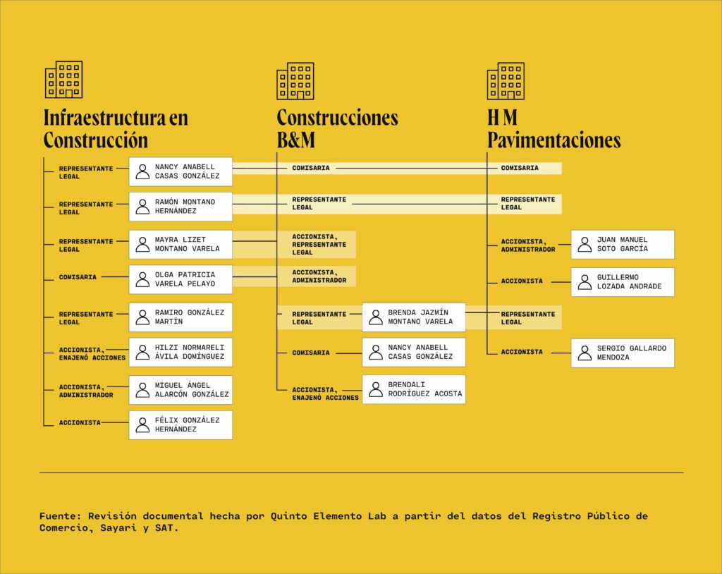 Infraestructura en Construcción se llevó 118 millones de pesos mediante 25 contrataciones. En esa compañía, Quinto Elemento Lab y AVC Noticias encontraron que un albañil y un jardinero figuraban como socios, aunque la persona que solía encargarse de los convenios era el representante legal, el arquitecto Ramón Montano Hernández, quien junto con su familia formaba parte de otras dos constructoras contra las que a veces simulaba competir para ganar licitaciones.