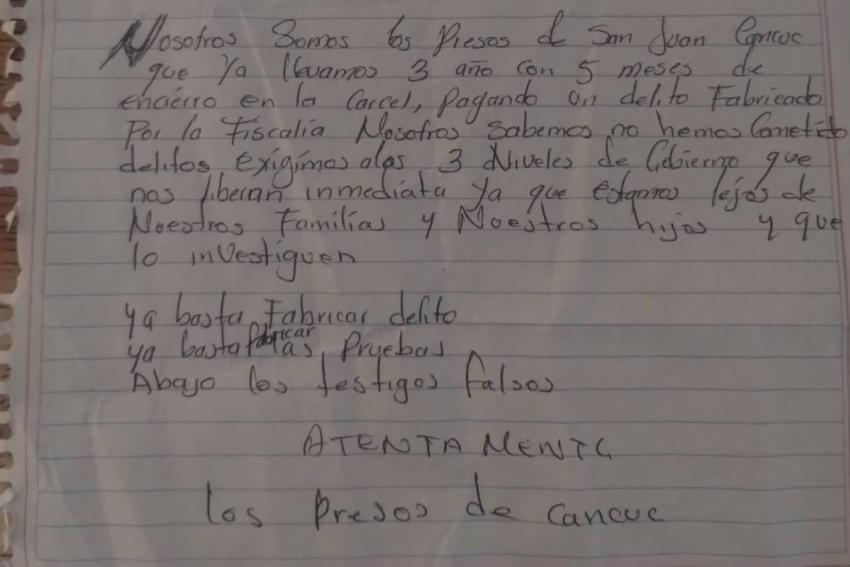 “Nosotros somos los presos de San Juan Cancuc que ya llevamos 3 años con 5 meses de encierro en la cárcel, pagando un delito por la Fiscalía. Nosotros sabemos que no hemos cometido delitos, exigimos a los 3 niveles de gobierno que nos liberen inmediatamente ya que estamos lejos de nuestras familias y nuestros hijos y que investiguen”, reza el breve texto escrito desde el penal.