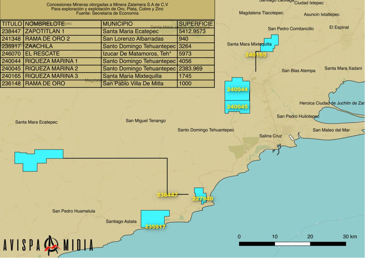 Tan solo en la región que comprende el Istmo de Tehuantepec, Oaxaca, la Minera Zalamera S.A de C.V cuenta con 7 concesiones mineras para la explotación de oro, plata, cobre y zinc principalmente. Junto a Zapotitlan está también, Jackita en Santo Domingo Zanatepec, San José en el municipio de Ayala, Aurena en Santo Domingo Tehuantepec, Riqueza Marina 1 y 2 en Santo Domingo Tehuantepec, Riqueza Marina 3 en Santa María Mixtequilla. Ninguno de estos municipios ha sido consultado para emitir estas concesiones, mucho menos las comunidades aledañas, que también serían afectadas. Ya que existen otras empresas que también tienen concesiones. “En la región que comprende el Istmo y Chontal estamos hablando de más de 60 concesiones”, señala el abogado de Tequio Jurídico.