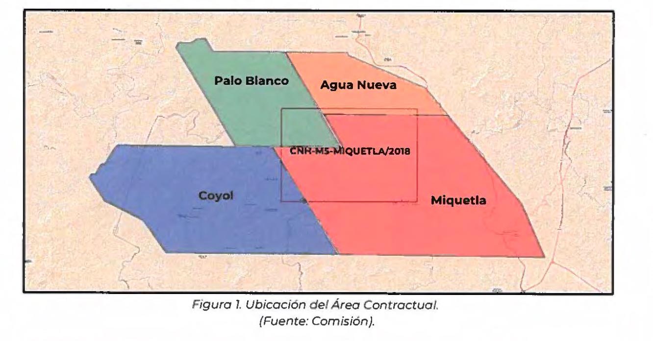Área contractual Miquetla y los cuatro campos que podrían unificarse bajo el mismo operador. Fuente: CNH.