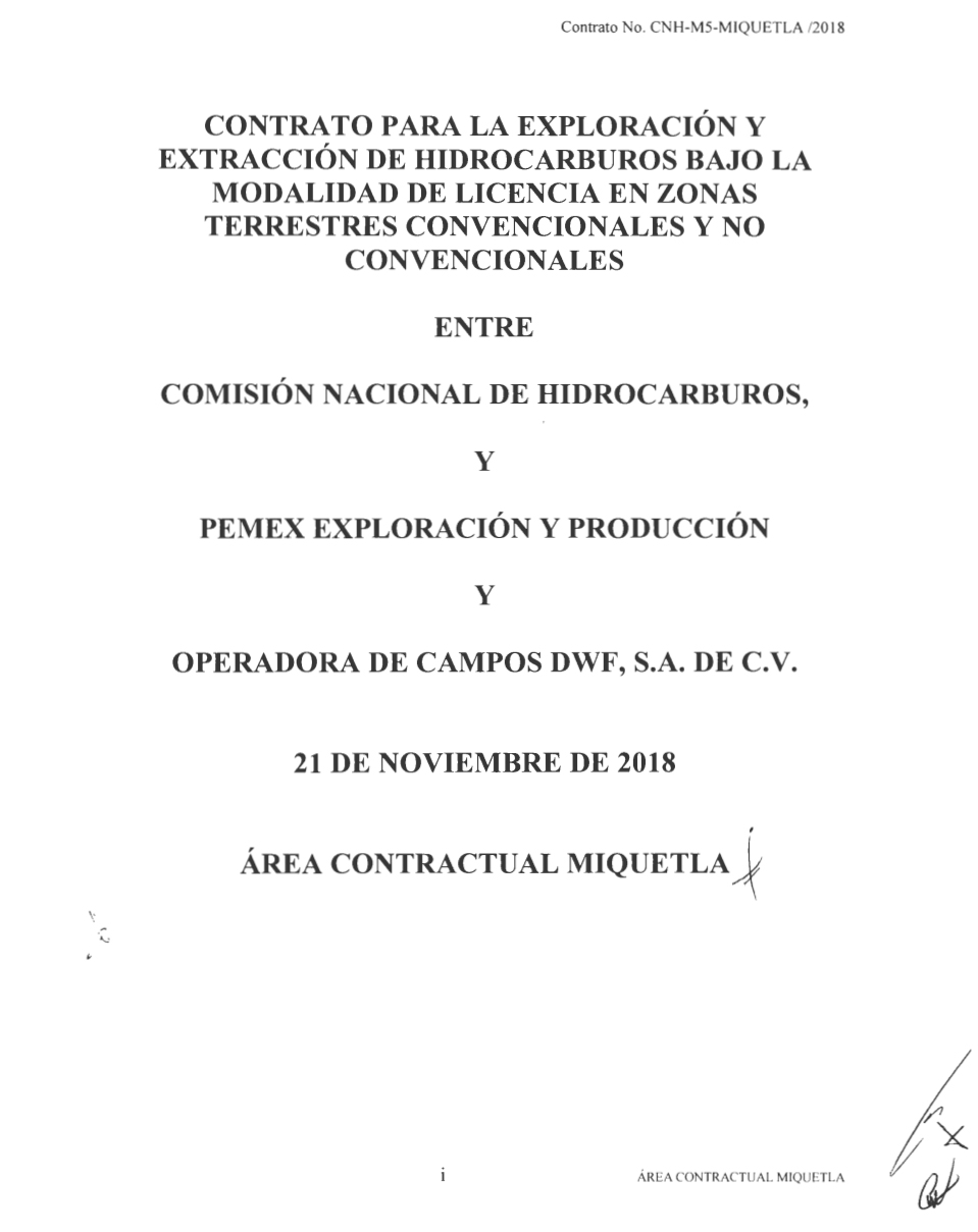 En julio de 2013, el fallo de la licitación otorgó a Operadora de Campos DWF el Contrato Integral de Exploración y Producción (CIEP) para realizar servicios para PEP en el área Miquetla. Este contrato estableció como objetivo primordial la “ejecución de todas las actividades necesarias para la producción de Hidrocarburos”, mientras que afirmaba que la explotación petrolera en el campo Miquetla sería en todo momento propiedad de PEP.