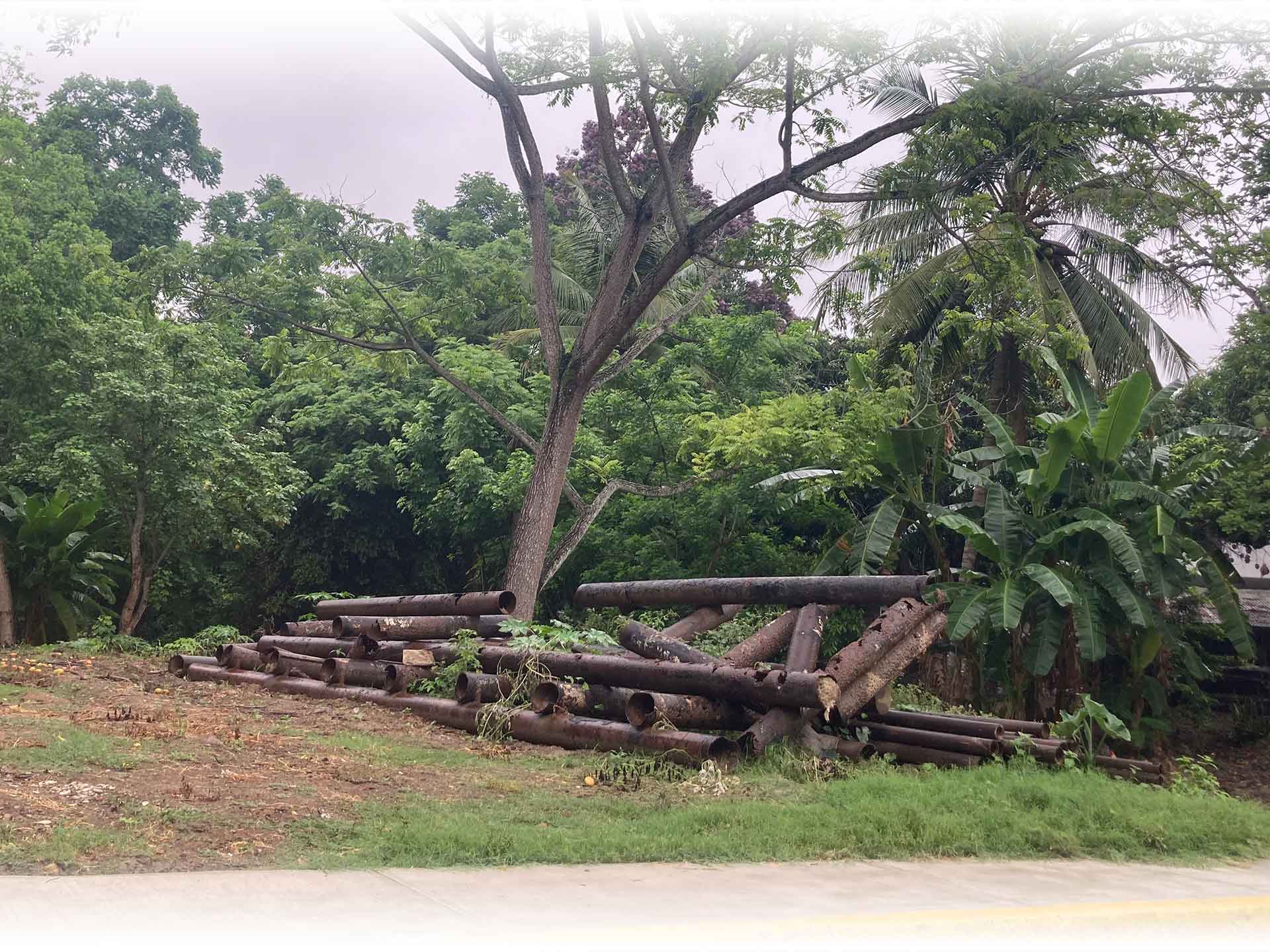 Fragmentos de ductos oxidados abandonados en la intemperie reposan junto a un pequeño arroyo, que serpentea a un costado de la carretera que atraviesa la comunidad.